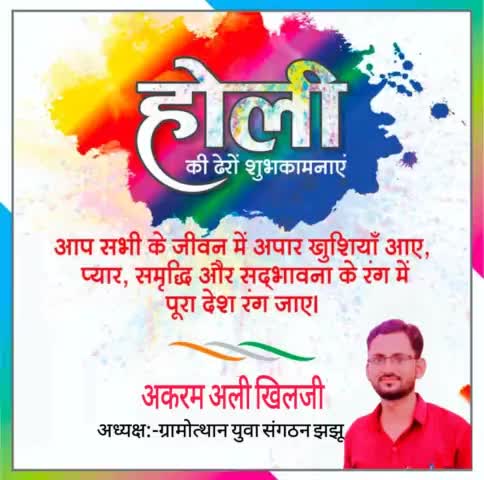कोलायत:-ग्रामोत्थान युवा संगठन झझू अध्यक्ष अकरम अली खिलजी देश व प्रदेशवासियों को होली की शुभकामनाएं दीं।