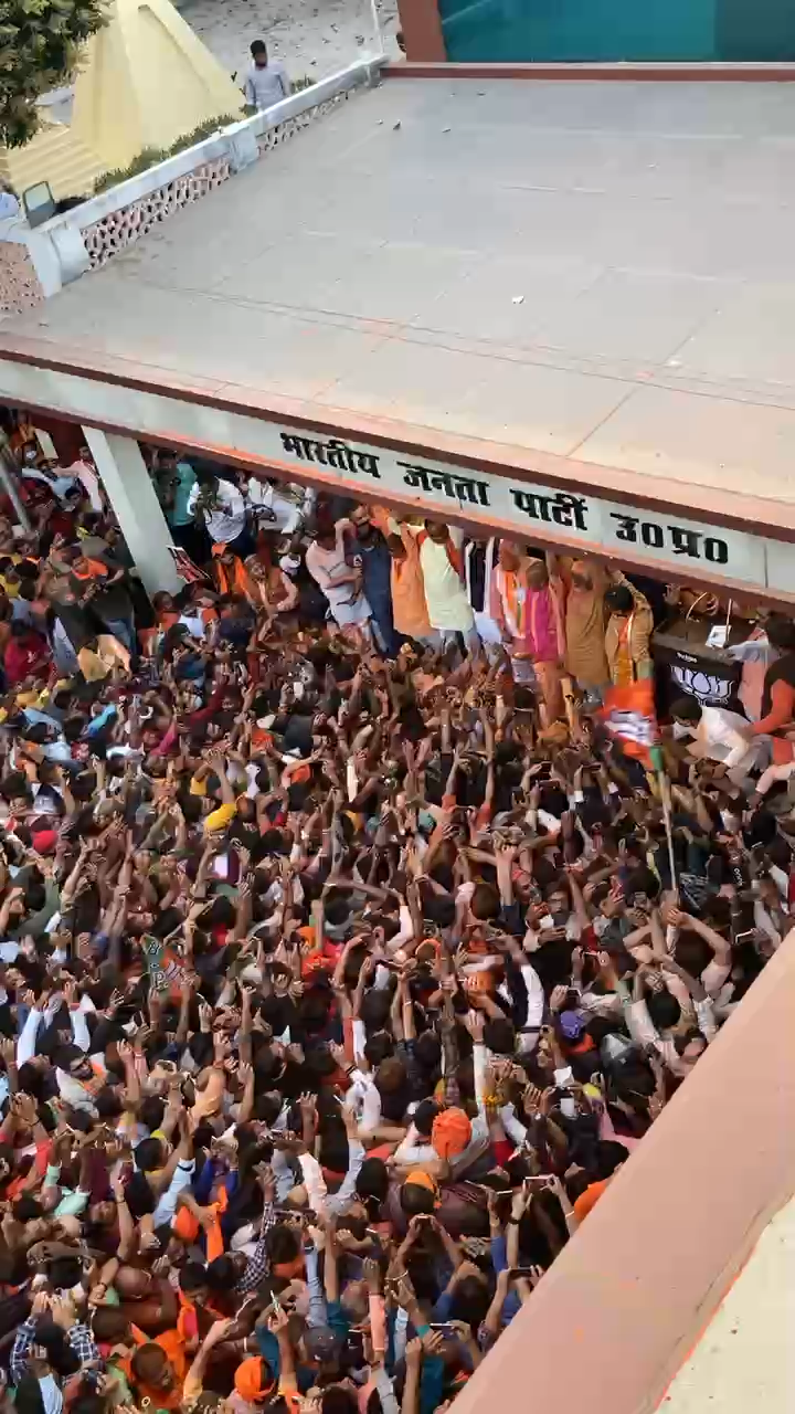 जीत के बाद भाजपा कार्यालय लखनऊ पर जश्न मनाते कार्यकर्ता..।