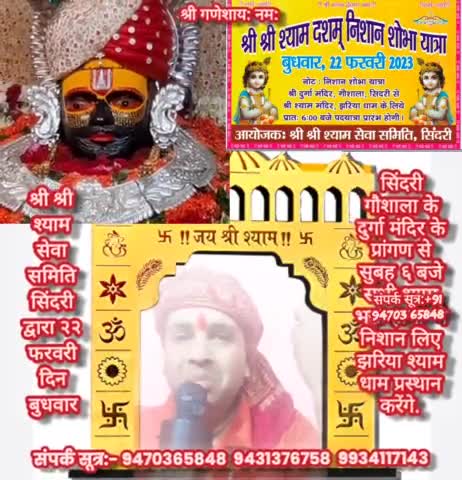 कलियासोल: सिंदरी,गौशाला दुर्गा मंदिर के प्रांगण से 22 फरवरी को प्रात: श्री श्याम निशान शोभा यात्रा झरिया श्याम धाम को निकलेगी.#