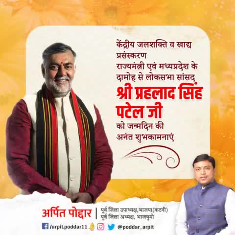 केंद्रीय खाद्य प्रसंस्करण, उद्योग एवं जल शक्ति राज्यमंत्री श्री प्रह्लाद सिंह पटेल जी को जन्मदिन की हार्दिक बधाई💐 ईश्वर से आपके स्वस्थ, सफल व सुदीर्घ जीवन की कामना करता हूं।