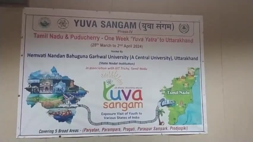 युवा संगम के तहत आज तमिलनाडु पुडुचेरी के 46 छात्र-छात्राएं व 4 फैकल्टी मेंबर एचएनबी गढ़वाल केंद्र विश्वविद्यालय के चौरास कैंपस पहुंचे। यहां मंगल गीतों के साथ छात्र-छात्राओं का फूल माला पहनकर स्वागत किया गया। तमिलनाडु और पुडुचेरी के छात्र-छात्राएं उत्तराखंड की धार्मिक और पर्यटक स्थलों का भ्रमण कर यहां की संस्कृति को जानेंगे