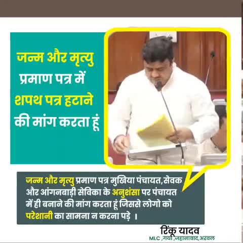 जन्म और मृत्यु प्रमाण पत्र में शपथ पत्र हटाने की मांग करता हूँ MLC Rinku Yadav ने सदन मे रखी अपनी बाते।