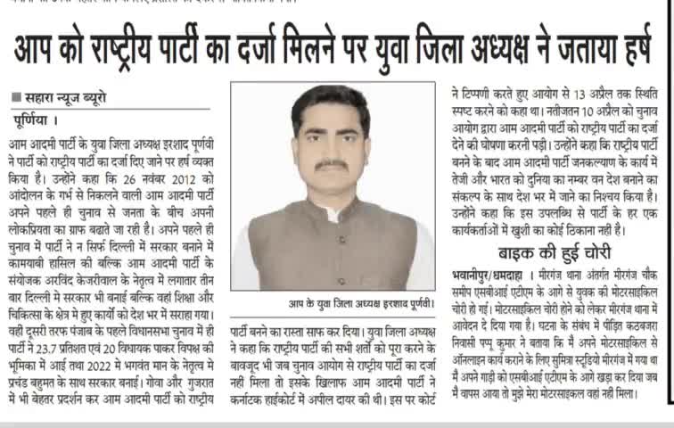 आप को राष्ट्रपार्टी बने पर आपके युवा जिला अध्यक्ष इरशाद पूर्णवी ने हर्ष व्यक्त किया