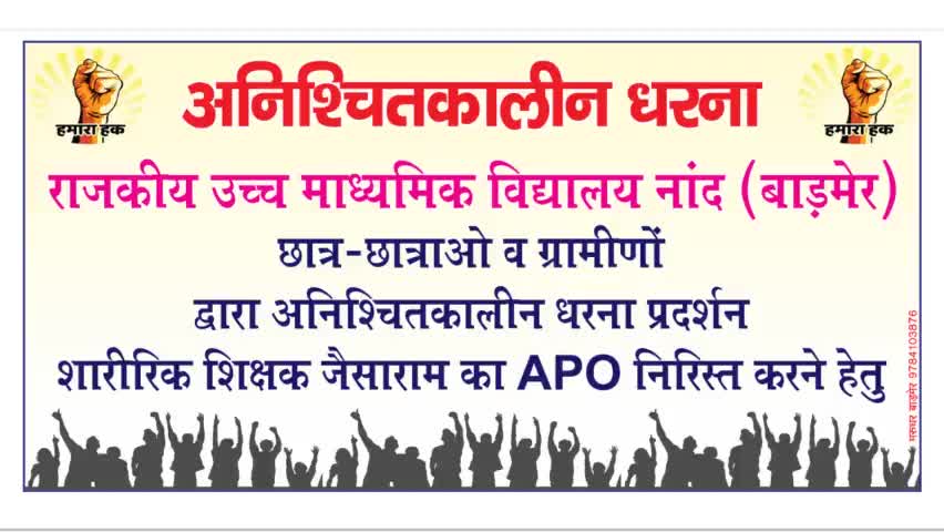 राजकीय माध्यमिक विद्यालय नांद के छात्र-छात्राओं व नांद वासियों की एक ही मांग शिक्षक का A.P.O.निरस्त करो।