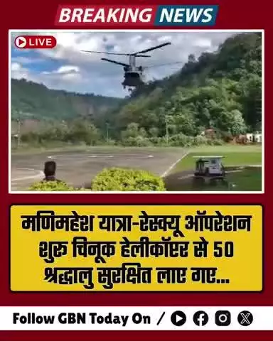 🚁 मणिमहेश यात्रा रेस्क्यू ऑपरेशन जारी 🚁 वायुसेना के चिनूक हेलीकॉप्टर से 50 श्रद्धालु भरमौर से चंबा सुरक्षित लाए गए। मौसम साफ, सभी श्रद्धालुओं के सुरक्षित रेस्क्यू की उम्मीद। #ManimaheshYatra #RescueOperation #IndianAirForce #ChinookHelicopter #HimachalPradesh #DisasterRelief #Chamba #Bharmaur #DevotionAndSafety #YatraUpdate #gbntoday