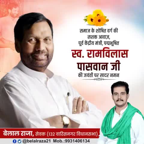 समाज के शोषित वर्ग की सशक्त आवाज़ पूर्व केंद्रीय मंत्री, पद्मभूषित स्व. रामविलास पासवान जी की जयंती पर सादर नमन।
