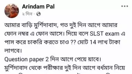 পুলিশের নজরদারিতে একটি ফেসবুক পোস্ট নজরে আসে, যেখানে Arindam Pal নামের এক ব্যক্তি স্কুল সার্ভিস কমিশনের আসন্ন SLST পরীক্ষার প্রশ্নপত্র ও তার উত্তর, পরীক্ষার দুদিন আগে পাইয়ে দেওয়ার কথা বলেছে l উক্ত পোস্টটিতে ওই ব্যক্তি নিজেকে মুর্শিদাবাদের বলে দাবি করেন l বিষয়টি নজরে আনা আসার সাথে সাথে পশ্চিম মেদিনীপুর জেলা পুলিশ তদন্ত শুরু করে ও তদন্তে উঠে আসে।