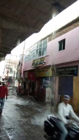 राबर्टसगंज के धर्मशाला चौराहे पर फ्लाईओवर से गिरते हुए बारिश की पानी से सड़कों पर हो रहा है जलजमाव ।