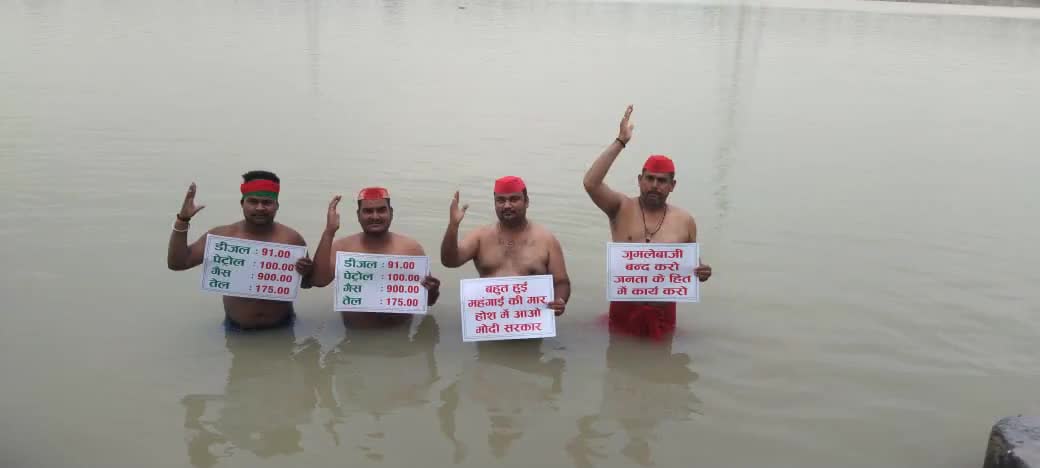आज हम लोग अर्धनग्न होकर पानी में महंगाई के खिलाफ प्रधानमंत्री जी के संसदीय क्षेत्र वाराणसी विरोध जताया