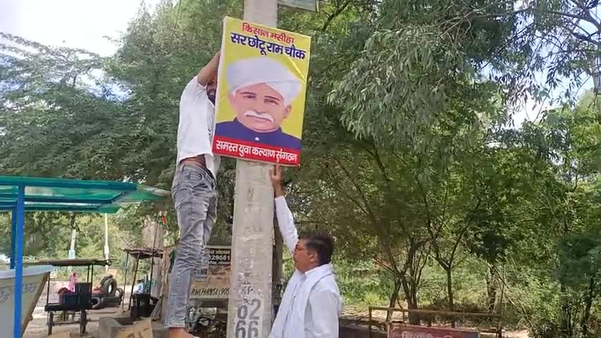 तोशाम हंसी रोड पर तहसील के पास वाला चौक पर सर छोटू राम का होल्डिंग लगाते हुए युवा कल्याण संगठन के पदाधिकारी