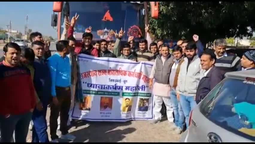 चूरू: कलेक्ट्रेट सर्किल से ध्यान आकर्षण रैली में भाग लेने के लिए चूरू के मंत्रालयिक कर्मचारी जयपुर रवाना हुए