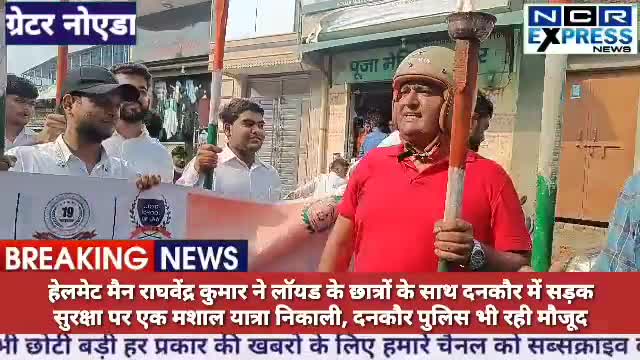 हेलमेट मैन राघवेंद्र कुमार ने लॉयड के छात्रों के साथ दनकौर में सड़क सुरक्षा पर एक मशाल यात्रा निकाली।