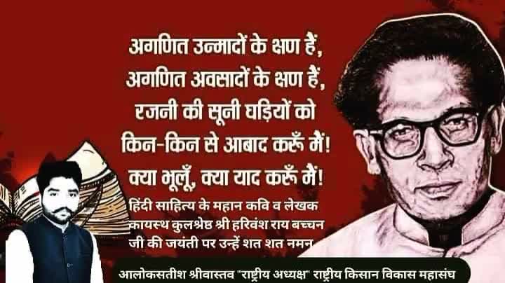 मातृभाषा हिन्दी के श्रेष्ठ कवि एवं लेखक 'पद्मभूषण' से सम्मानित महान छायावादी रचनाकार कायस्थ कुलश्रेष्ठ श्री हरिवंश राय बच्चन जी की जयंती पर उन्हें कोटिशः वंदन🙏