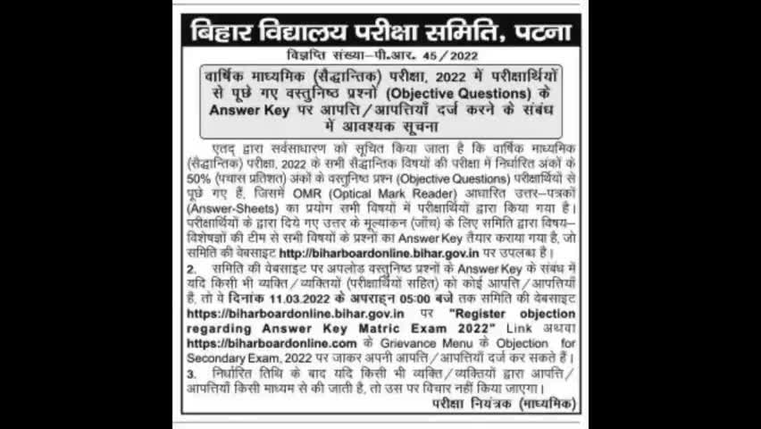 बिहार बोर्ड मेट्रिक 2022 का आंसर की जारी कर दिया गया है सभी छात्र छात्राएं अपना जाकर आंसर की चेक करें #biharboard #bihar