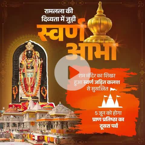 आए जब रघुनंदन, दमके अवध के द्वार, स्वर्ण कलश से सजा शिखर, बंधे बंधन वार अब रामलला की दिव्याता में जुडी स्वर्ण आभा, राम मंदिर का शिखर हुआ स्वर्ण जड़ित कलश से सुसज्जित। 5 जून को होगा प्राण प्रतिष्ठा का दूसरा पर्व