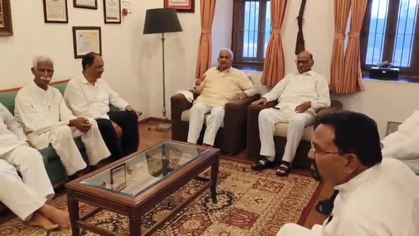 राष्ट्रवादीचे नेते शरद पवार यांनी आज दिनांक 18 एप्रिल रोजी सायंकाळी सात वाजता माजी मंत्री दादा जाधवराव यांची जाधववाडी येथील निवासस्थानी भेट घेतलीय...जाधवराव आणि शरद पवार हे राजकारणातील जुने सहकारी आहेत.मात्र 30 वर्ष आमदार राहिलेल्या दादा जाधवराव यांना शरद पवारांच्या एका वक्तव्याने पराभवाचा सामना करावा लागला होता. तेव्हा पासून वीस वर्ष या दोघांची भेट झाली नव्हती....लोकसभा निवडणुकीच्या पार्श्वभूमीवर शरद पवार अनेक जुन्या पण दुरावलेल्या किंवा दुखावलेल्या सहकाऱ्यांच्या गाठी भेटी घेत आहेत.