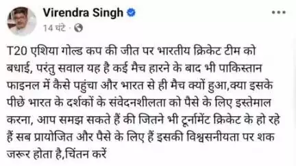 एशिया कप के फाइनल में पाकिस्तान से जीत के बाद भारत की पूरी दुनिया में चर्चा है। फाइनल मैच जीतने के बाद चंदौली से सपा सांसद वीरेंद्र सिंह ने भारतीय क्रिकेट टीम को अपने सोशल मीडिया प्लेटफॉर्म फेसबुक पर सोमवार सुबह बधाई दी। वही सवाल उठाया है कि कई मैच हारने के बाद भी पाकिस्तान फाइनल में कैसे पहुंचा और भारत से ही मैच क्यों हुआ सब पैसे के लिए प्रायोजित है।