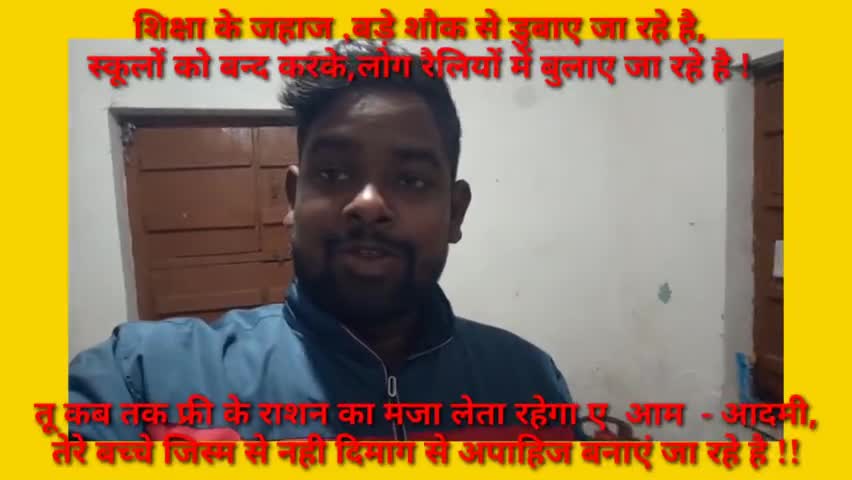 शिक्षा के जहाज ,बड़े शौक से डुबाए जा रहे है, स्कूलों को बन्द करके,लोग रैलियों में बुलाए जा रहे है ! तू कब तक फ्री के राशन का मजा लेता रहेगा ए आम - आदमी, तेरे बच्चे जिस्म से नही दिमाग से अपाहिज बनाएं जा रहे है !!