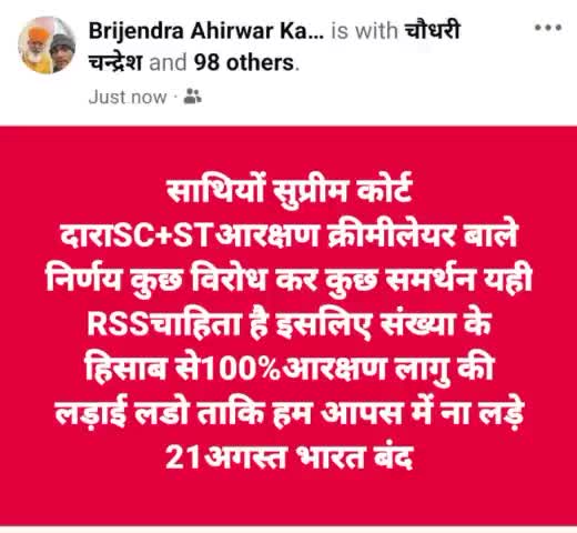 साथियों सुप्रीम कोर्ट दाराSC+STआरक्षण क्रीमीलेयर बाले निर्णय कुछ विरोध कर कुछ समर्थन यही RSSचाहिता है इसलिए संख्या के हिसाब से100%आरक्षण लागु की लड़ाई लडोSC+ST+OBCसामान्य भी ताकि हम आपस में ना लड़े21अगस्त भारत बंद
