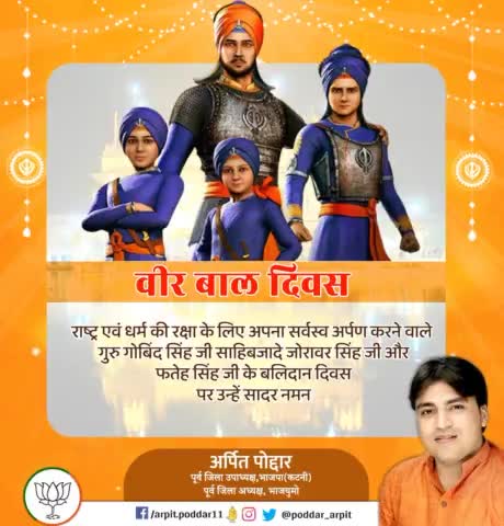 राष्ट्र एवं धर्म की रक्षा के लिए अपना सर्वस्व अर्पण करने वाले गुरु गोबिंद सिंह जी के साहिबजादे जोरावर सिंह जी और फतेह सिंह जी के बलिदान दिवस पर उन्हें सादर नमन🙏 #वीर_बाल_दिवस #VeerBalDiwas