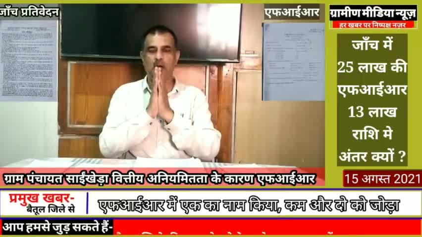 मुलताई विकास खण्ड की ग्राम पंचायत साईंखेड़ा की आर्थिक अनियमितता के कारण एफआईआर दर्ज। बैतूल जिला मुख्य कार्यपालन