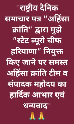 राष्ट्रीय दैनिक समाचार पत्र अहिंसा क्रांति द्वारा स्टेट ब्यूरो चीफ हरियाणा नियुक्त किए जाने पर हार्दिक आभार / धन्यवाद