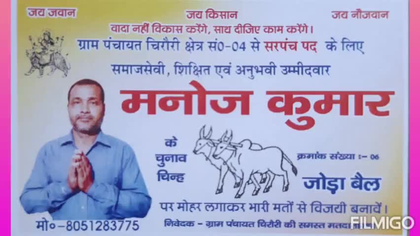 आपका अपना चुनाव चिन्ह #जोड़ा_बैल, जो मत पत्र के क्रम. संख्या - 06 पर है #चिरौरी पंचायत से #सरपंच_उम्मीदवार #मनोज_कुमार