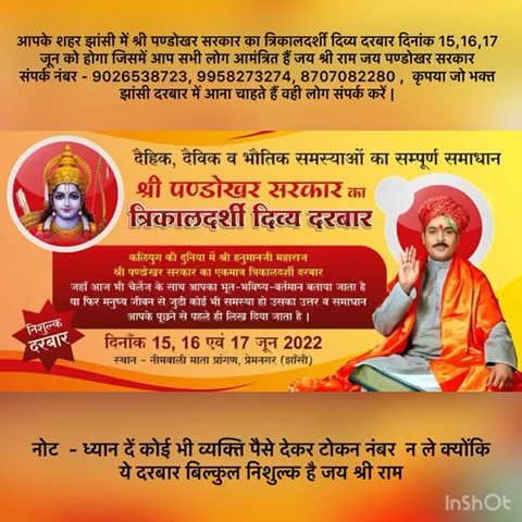 15,16 एवं 17 जून 2022, नीमवाली माता का प्रांगण प्रेमनगर नगरा झाँसी 284003 उत्तर प्रदेश समय 12 बजे से बालाजी महाराज की इच्छा तक संपर्क - 9026538723