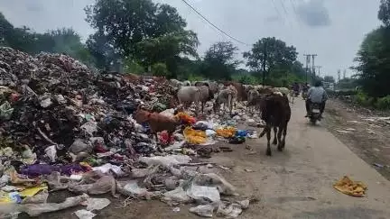 नरसिंहपुर-सांकल मार्ग पर कचरे का पहाड़! सड़क किनारे ही डंप हो रहा पूरा नगर का कचरा, गोवंश मजबूरी में खा रहा सड़ी-सामग्री