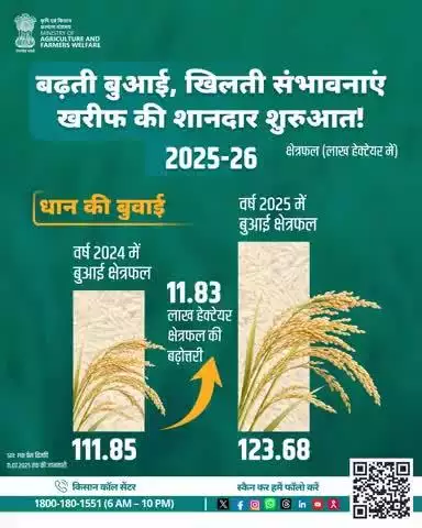 खरीफ 2025-26 में धान की बुआई 11.83 लाख हेक्टेयर बढ़ी, कुल क्षेत्रफल 123.68 लाख हेक्टेयर तक पहुंचा! #AgriGoI #Kharif