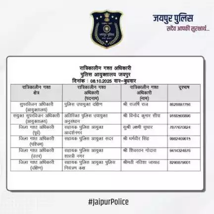 उक्त अधिकारियों की रात्रिकालीन गस्त 12 AM से 5 AM तक रहेगी। रात्रि में किसी प्रकार की सहायता के लिए उक्त अधिकारियों से संपर्क कर सकते हैं। आपकी सुरक्षा हमारी प्राथमिकता है।