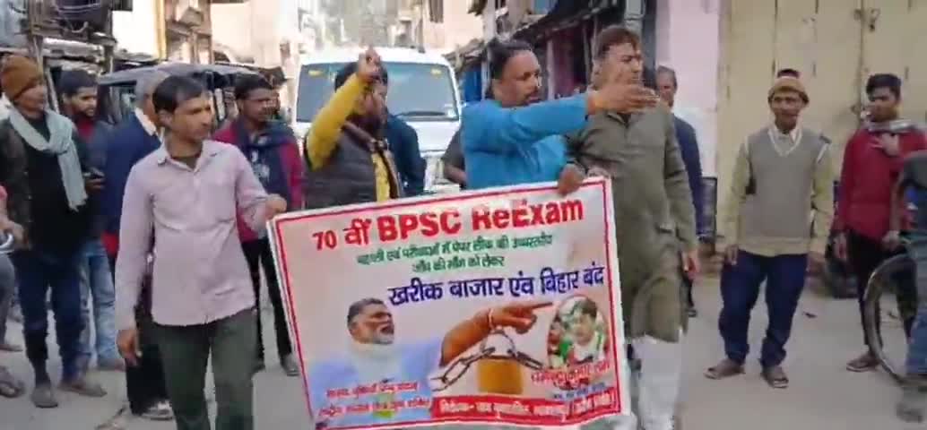 नवगछिया अंतर्गत खरीक बाजार में छात्र युवा शक्ति धर्मेन्द्र कुमार शर्मा के नेतृत्व में रविवार को दोपहर 2:00 दर्जनों युवा साथी ने मिलकर बंद करवाने का काम किया है यह सिर्फ बीपीएससी परीक्षाओ पेपर लीक के खिलाफ हमारी लड़ाई है! आज बीपीएससी, कल सिपाही भर्ती, परसों क्लर्क परीक्षा, और मेडिकल परीक्षाएँ—हर जगह माफिया का राज है। हाल ही में जदयू विधायक के भ