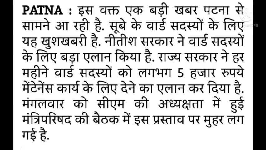 बिहार: मुख्यमंत्री नीतीश कुमार जी ने कहा कि वार्ड सदस्य को हर महीने 5000 रूपए maintence के लिए दिए जाएँगे ।