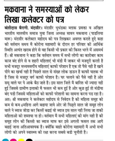लोक डाऊन के चलते महिलाओ समूह की किस्तो मै रात दी जाये उक्त पत्र लिखकर कलेक्टर महोदय से निवेदन किया गया