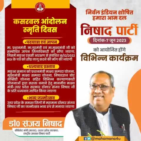 आदरणीय राष्ट्रीय अध्यक्ष एवं कैबिनेट मंत्री Dr.Sanjay Kumar Nishad जी के निर्देशानुसार दिनांक-7 जून होने वाले कार्यक्रम