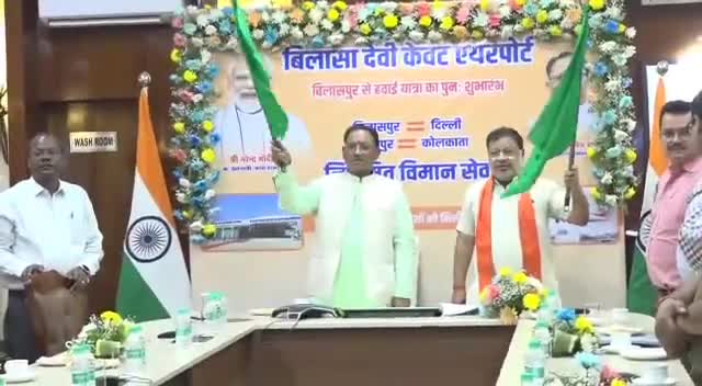 मुख्यमंत्री श्री विष्णु देव साय ने आज अपने निवास कार्यालय रायपुर से वर्चुअली हरी झंडी दिखाकर बिलासा देवी केंवट विमानतल, बिलासपुर से बिलासपुर-दिल्ली और बिलासपुर-कोलकाता सीधी हवाई सेवा का शुभारंभ किया। उप मुख्यमंत्री श्री अरुण साव सहित अनेक जनप्रतिनिधि बिलासा देवी केंवट विमानतल पर तथा मुख्यमंत्री निवास पर लोकसभा सांसद श्री सुनील सोनी उपस्थित थे।