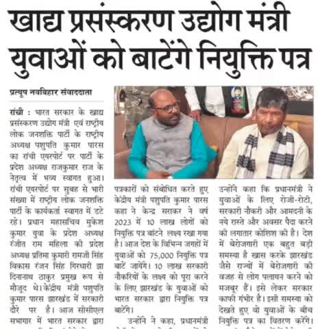 भारत सरकार के मंत्री पशुपति कुमार पारस ने दियानियुक्ति पत्र
