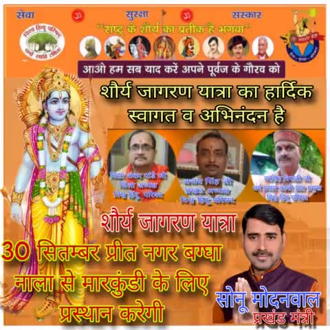 शुभ सूचना👏 शौर्य जागरण यात्रा ज्वालामुखी शक्ति नगर से चलकर वाराणसी के लिए प्रस्थान करेगी,जिस शौर्य जागरण यात्रा में आप सभी समस्त चोपन वासियों को,चोपन प्रीतनगर बग्घा नाला से मारकुंडी के लिए यात्रा में सम्मिलित हों कर यात्रा को सफल बनाएं👏