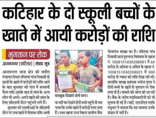 हमारे गृह जिला में 960 करोड़ जमा हुआ दो बच्चे के एकाउंट में