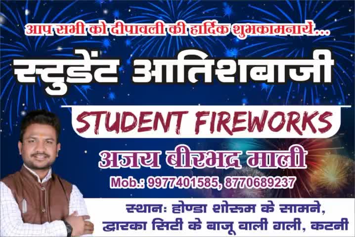 आप सभी को दीपावली की हार्दिक शुभकामनाएं । आपकी अपनी दुकान स्टूडेंट आतिशबाजी प्रतिवर्ष के अनुसार इस वर्ष भी अपने पुराने स्थान ---द्वारका सिटी के अंदर होंडा शोरूम के सामने वाली गली में।
