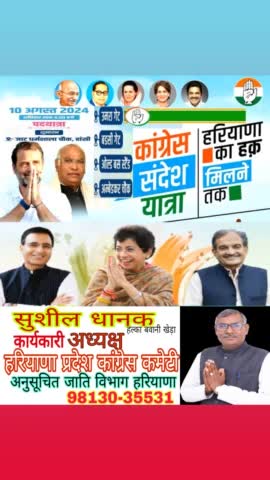 10 अगस्त 4 बजे हांसी में कांग्रेस संदेश यात्रा नेतृत्व करेंगी कुमारी शैलजा M P सदस्य CWC ज्यादा से ज्यादा संख्या में पहुंचे