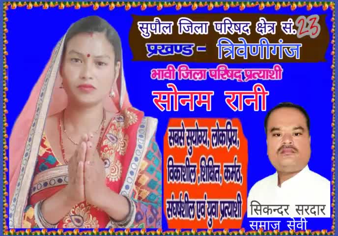 सुपौल जिला परिषद क्षेत्र संख्या 23 प्रखंड त्रिवेणीगंज से भावी प्रत्याशी सोनम रानी को मिल रहा है।भारी समर्थन और आशीर्वाद।