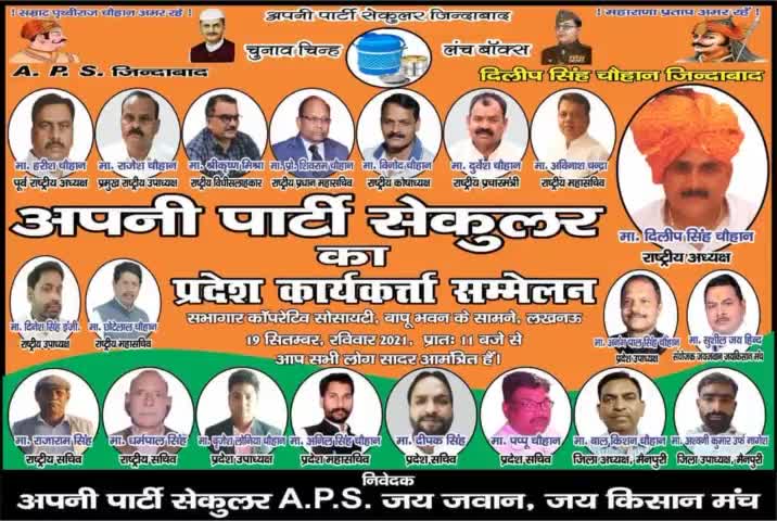 अपनी पार्टी सेकुलर कार्यकर्ता बैठक 19,,9,, 2021 लखनऊ में होगी सभी अपनी पार्टी सेकुलर के सभी पद अधिकारियों से निवेदन है कार्यक्रम मैं पहुंच कर सफल बनाएं