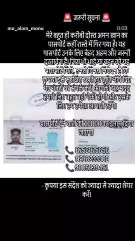 All the respected residents of the state are requested that whoever gets Aman Khan's passport should contact on the given contact number 8756 875 6 656, second number 99 1 8 23 3 369, thank you.