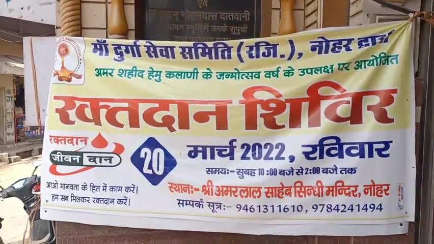 नोहर: शहीद हेमू कालानी के जन्मोत्सव को लेकर सिंधी मंदिर में आयोजित हुआ रक्तदान शिविर