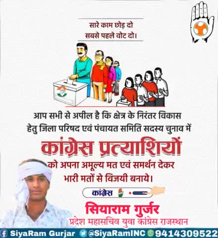 आज होने वाले पँचायत राज चुनाव में कांग्रेस को मत व समर्थन देकर विजय बनाये ।। जय कांग्रेस