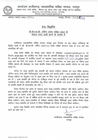 छत्तीसगढ़ व्यावसायिक परीक्षा मंडल रायपुर ने बीएससी नर्सिंग के जारी किए मॉडल आंसर 5 जुलाई तक कर सकते हैं दावा आपत्ति