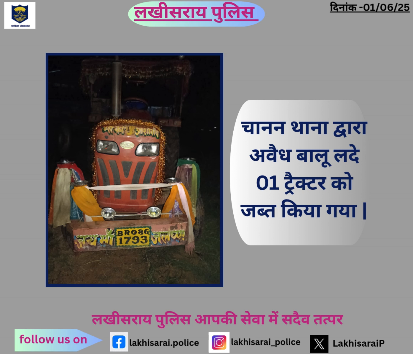 लखीसराय: चानन थाना द्वारा अवैध बालू लदे 01 ट्रैक्टर को जब्त किया गया |