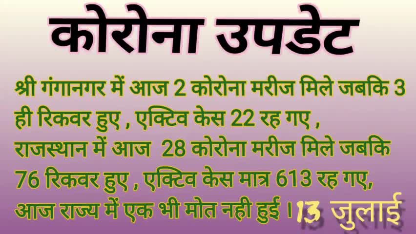 #श्रीगंगानगर में आज 2 कोरोना मरीज मिले जबकि 3 ही रिकवर हुए , एक्टिव केस 22 रह गए , #राजस्थान में आज 28 कोरोना मरीज मिले