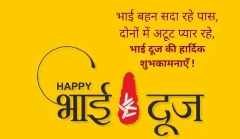 समस्त देशवासियों को "भाई दूज" के पावन पर्व की हार्दिक शुभकामनाएं। ईश्वर से प्रार्थना है कि परस्पर सौहार्द्र के इस पर्व पर आपसी भाईचारा और स्नेह बढ़े और सभी का जीवन आनंद, उल्लास तथा उत्तम स्वास्थ्य से परिपूर्ण हो।